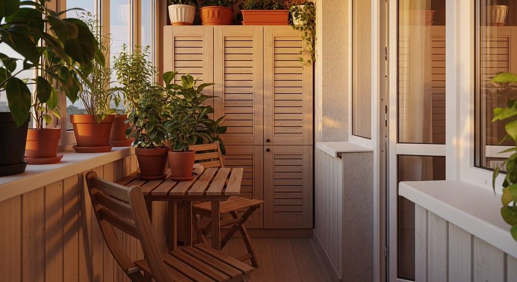 Мебель подбирайте по габаритам балкона. Откидные столы, складные стулья, скамьи-сундуки экономят место. Проход не менее 60–65 см обеспечивает комфорт. Свет — раздельные сценарии для работы и отдыха.