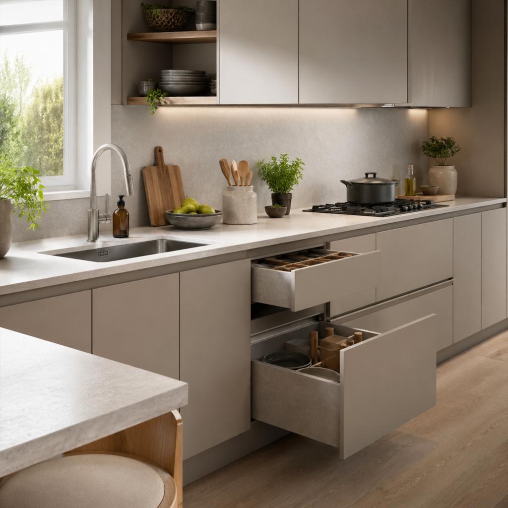 Хорошая кухня не заставляет подстраиваться под себя. Она учитывает, как часто вы готовите, сколько посуды храните, нужна ли зона для мелкой техники, где удобнее держать крупы, кастрюли, противни и бытовую химию. Для семьи с детьми важно предусмотреть надежные механизмы, удобную высоту хранения и безопасное расположение техники.