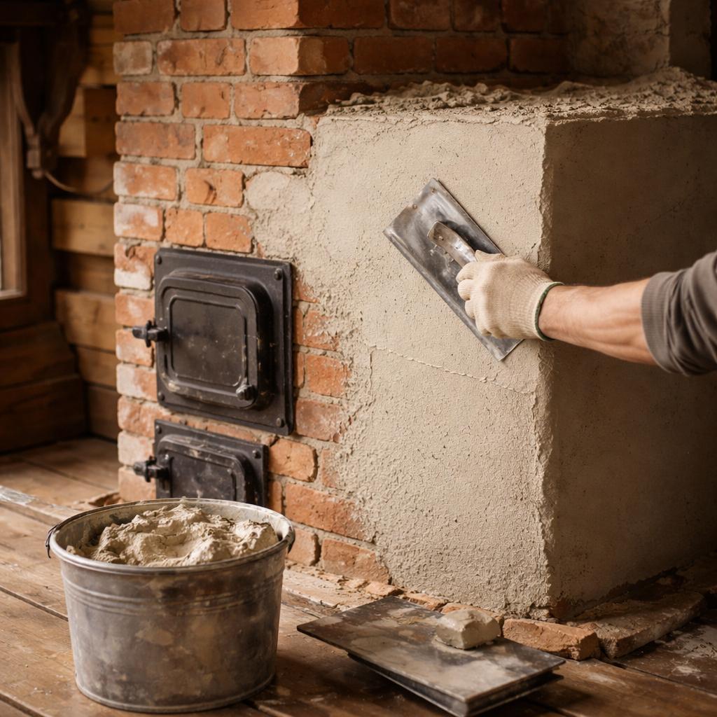 Распространённое заблуждение — использование стандартных цементно-песчаных штукатурок, предназначенных для стен и фасадов. В условиях печи такие составы работают плохо по нескольким причинам.