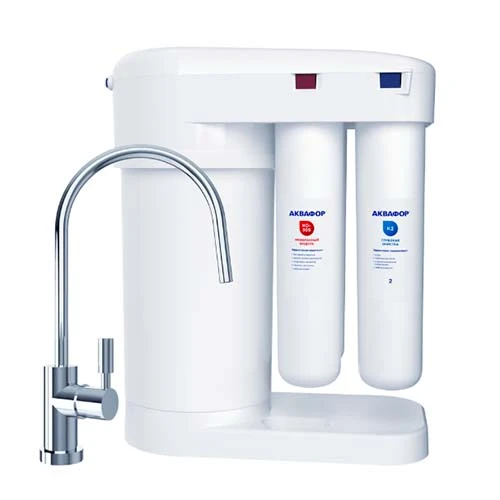 - Эстетика — фильтр полностью скрыт под мойкой, не занимает место на столешнице.