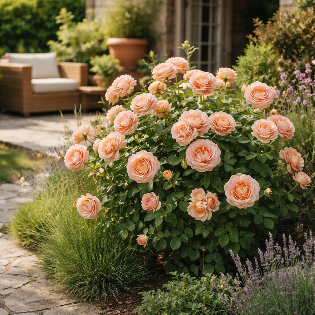 Куст «La Villa Cotta» формируется достаточно гармонично, без ощущения разрозненности побегов. Это важно для тех случаев, когда роза рассматривается как часть композиции — вдоль дорожек, рядом с террасой, у фасада дома или в смешанном цветнике. В отличие от сортов, требующих постоянного визуального контроля и коррекции, здесь форма куста обычно сохраняет читаемость сама по себе. На практике это означает, что растение выглядит «собранным» даже вне пика цветения, когда цветков немного или они только формируются.