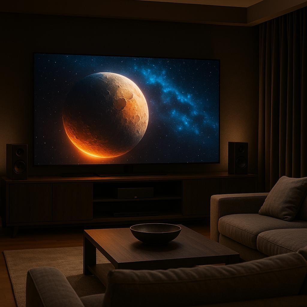 - Для просторного зала лучше брать от 75″ с OLED/QLED-матрицей.