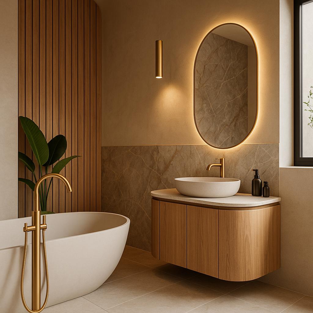 Главная тенденция 2025 года — стремление к естественности. После многих лет стереотипов о том, что ванная комната обязана быть «стерильной», в моду прочно вошли материалы, которые привносят уют и успокаивающую атмосферу.